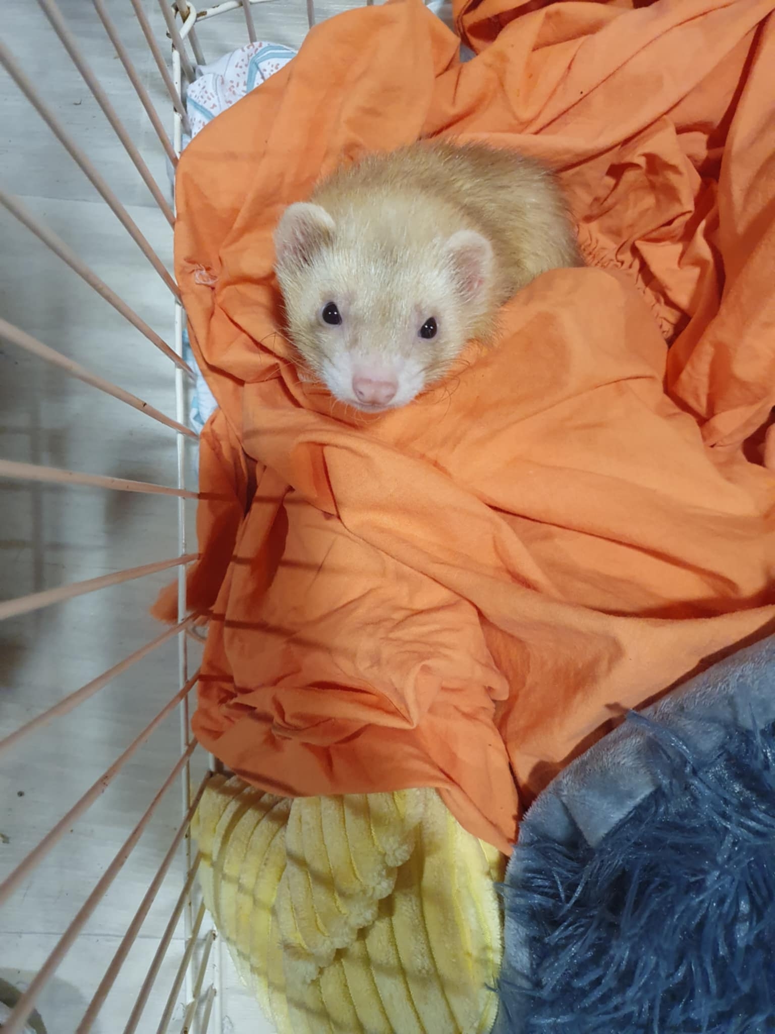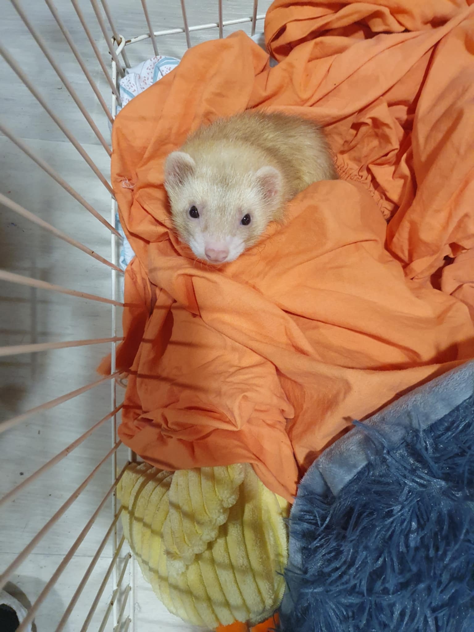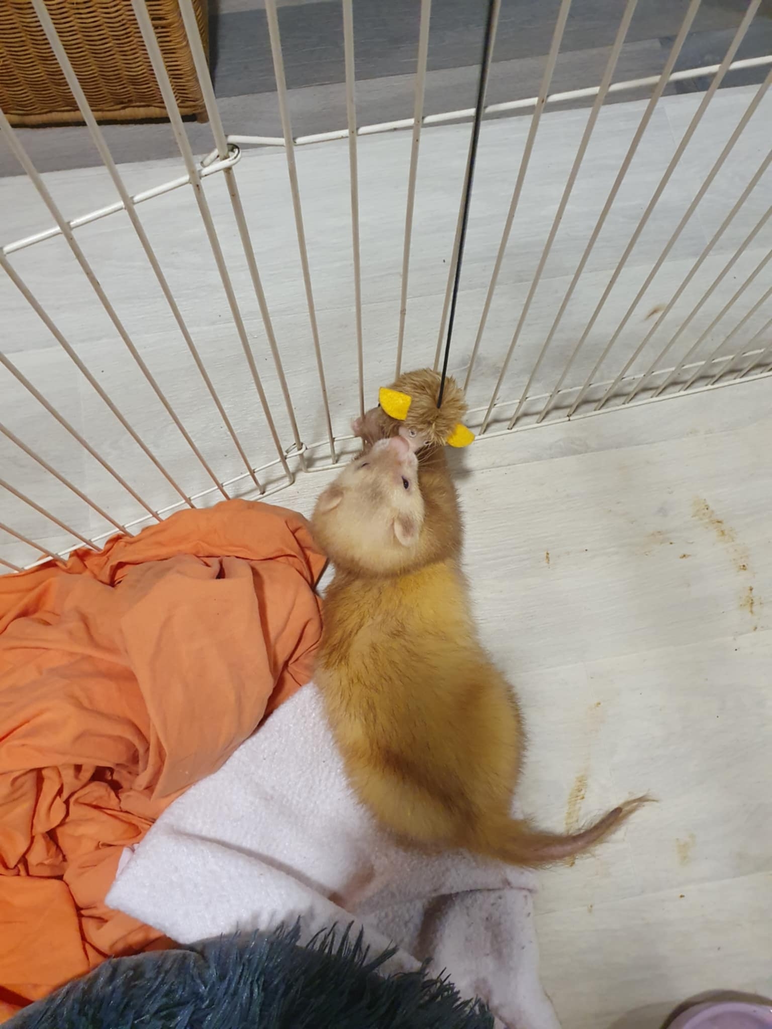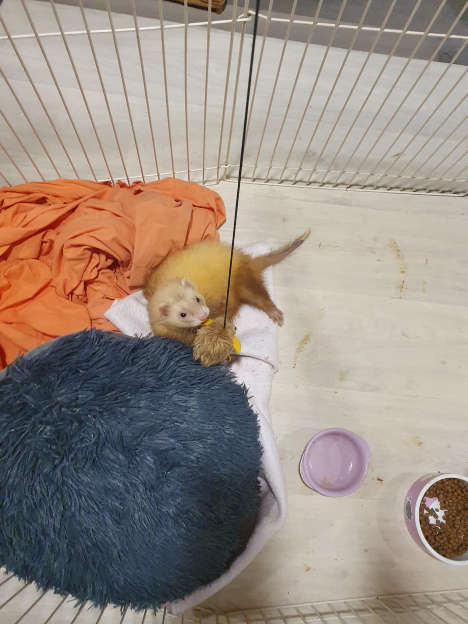 Il n'a pas l'air du tout agressif. Je peux lui mettre à manger et prendre ses gamelles mains nues sans aucun souci. Et les fois où je le prends dans les mains, je mets encore le gant par précaution mais il n'essaie pas du tout de mordre... alors qu'a priori il était sensé être mordeur. Il doit tout simplement se sentir bien ici. Il est encore en quarantaine alors je le laisse tranquille pour qu'il se remette de ses émotions mais il n'a pas l'air franchement perturbé, il demande le contact et demande à jouer. On a fait une bonne partie de canne à pêche tout à l'heure, il s'est éclaté. Mais sinon il est sage et il est propre, il fait tout dans le même coin du parc sur son alèse (par contre le bac à litière et les pellets pour le moment il ne sait pas à quoi ça sert, on lui apprendra après la cicatrisation de sa castration petit à petit, c'est pas grave ça, ça ira vite vu qu'il est déjà propre et ne fait pas partout, ce qui est super chouette pour un furet ruteux ! ).