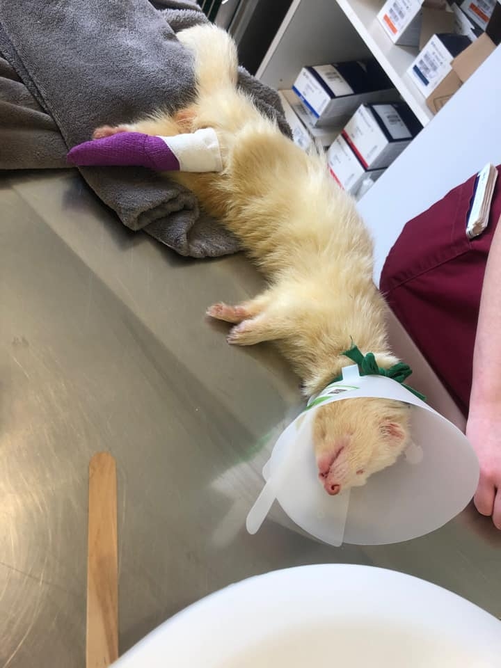 Maintenant ça va aller mieux, on va mettre en place la petite rééducation et il va vite galoper, sur 3 pattes, mais ça c'est pas grave pour les furets.