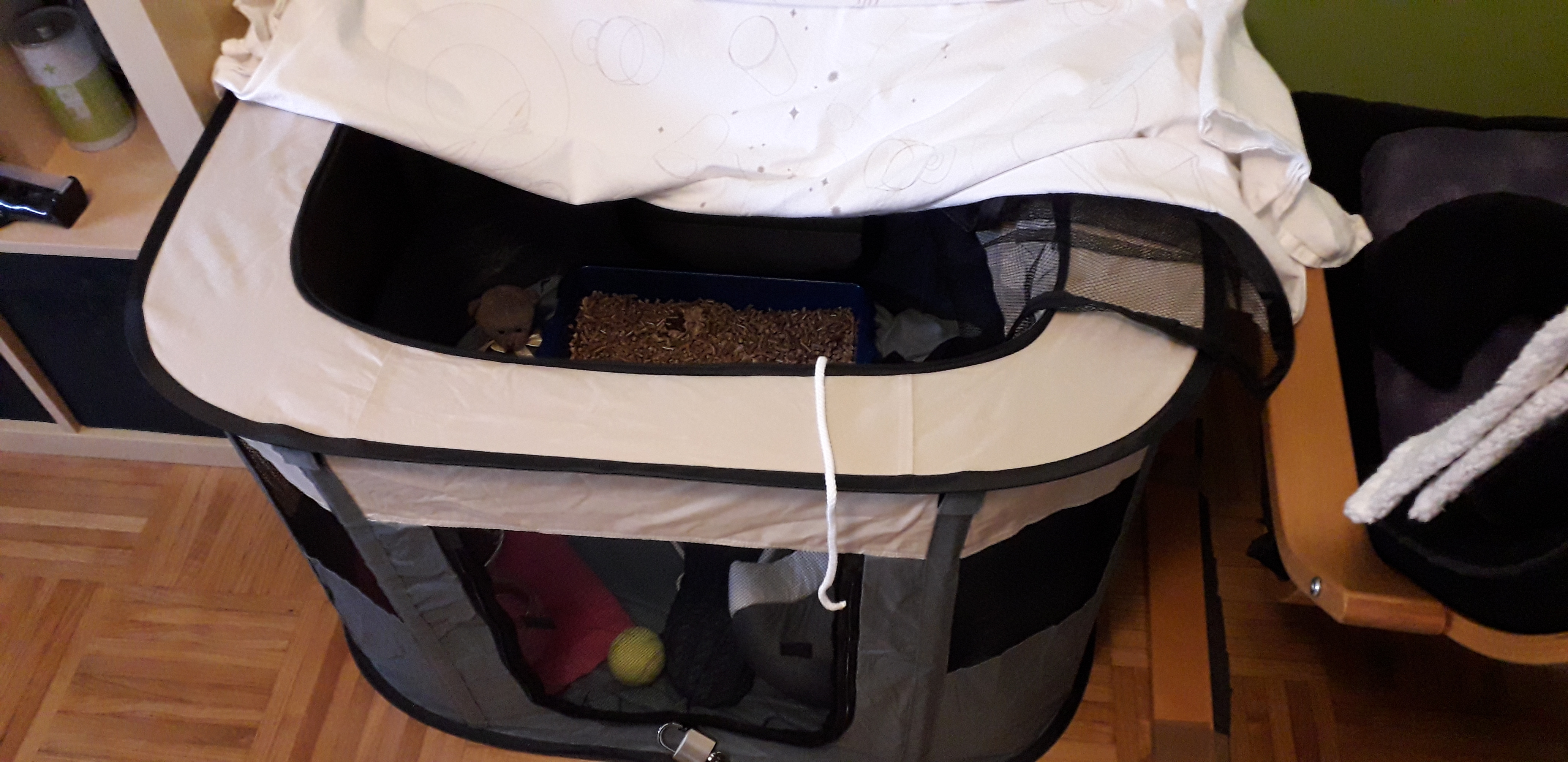 J'ai donc mis une couverture par dessus l'enclos et elle y est tout de suite allée pour y rester bien plus longtemps cette fois. Une étape de franchie. J'ai laissé la porte de l'enclos ouverte afin qu'elle puisse se sentir libre d'entrer et sortir quand elle voulait. Cela a duré un bon moment. Puis à quelques reprises, j'ai fermé la porte, et à chaque fois, elle sortait les griffes pour essayer d'en sortir.