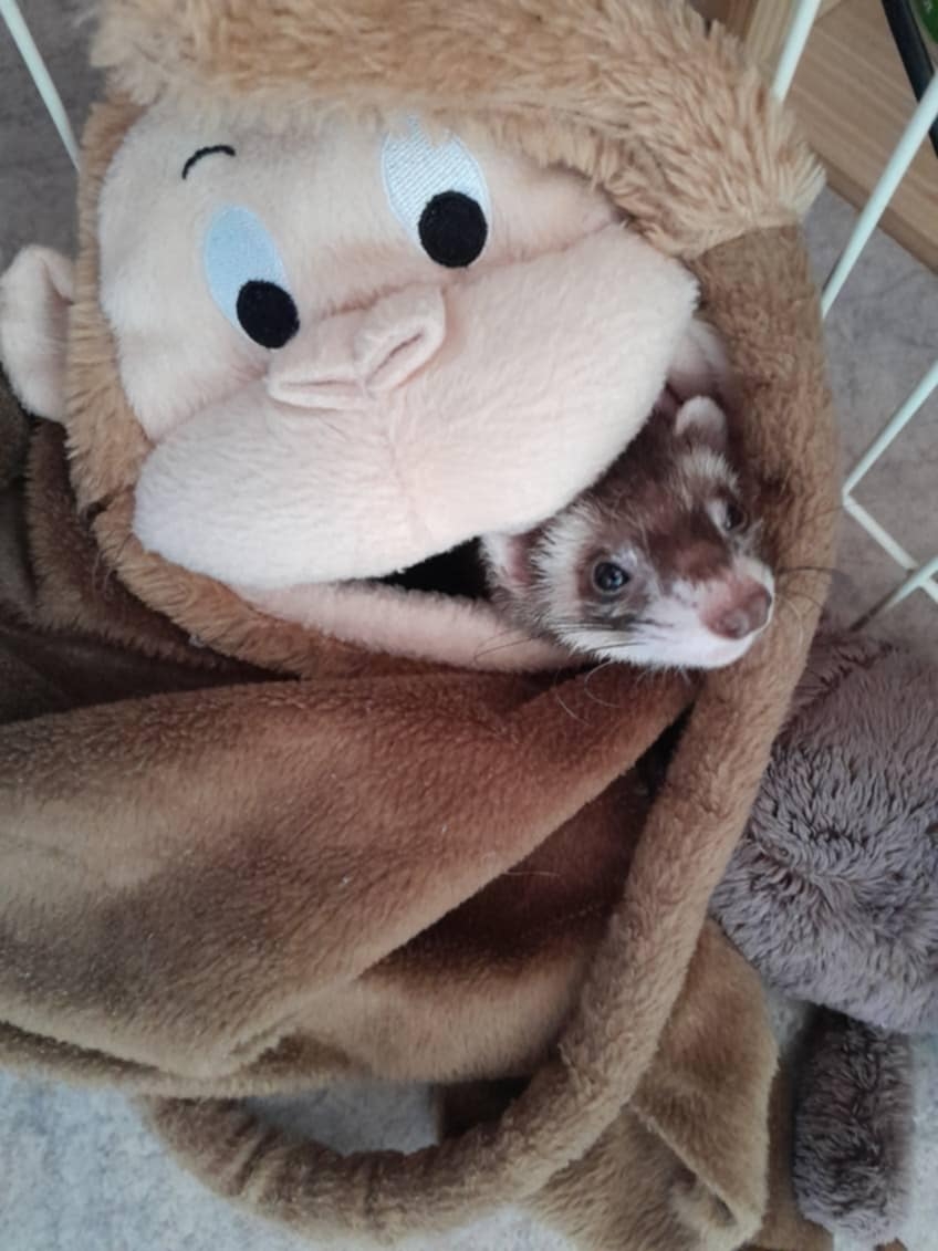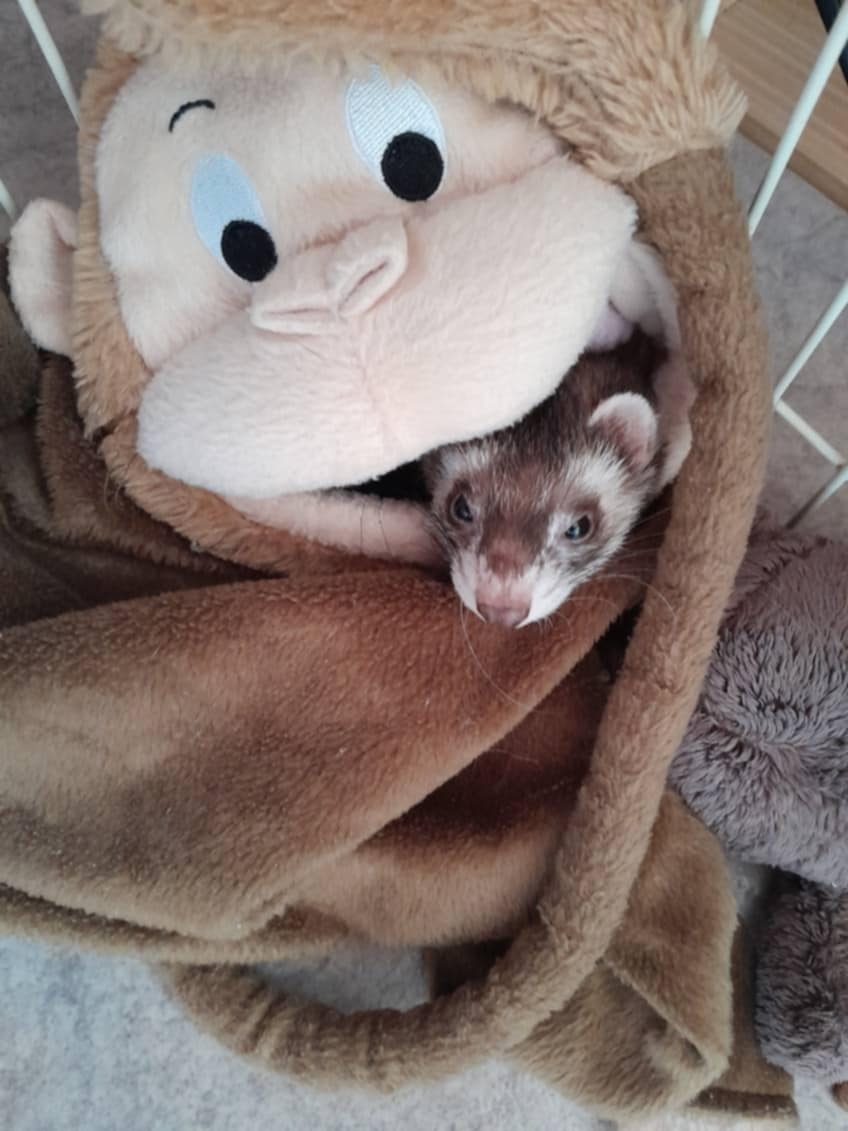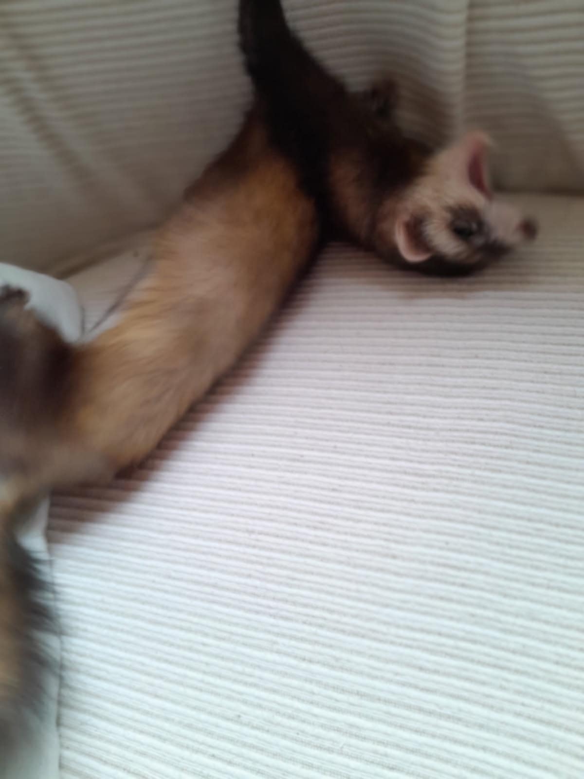 C'est une petite furette putoisée d'un an, toute mignonne, toute gentille, nourrie aux croquettes mais elle aime bien aussi la pâtée pour chat et la viande.