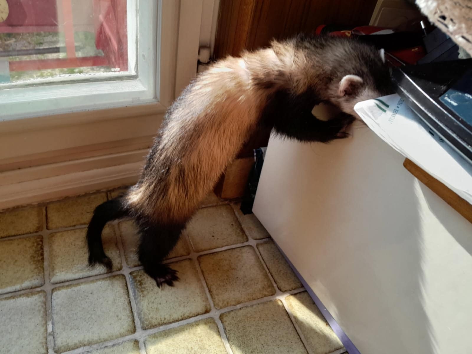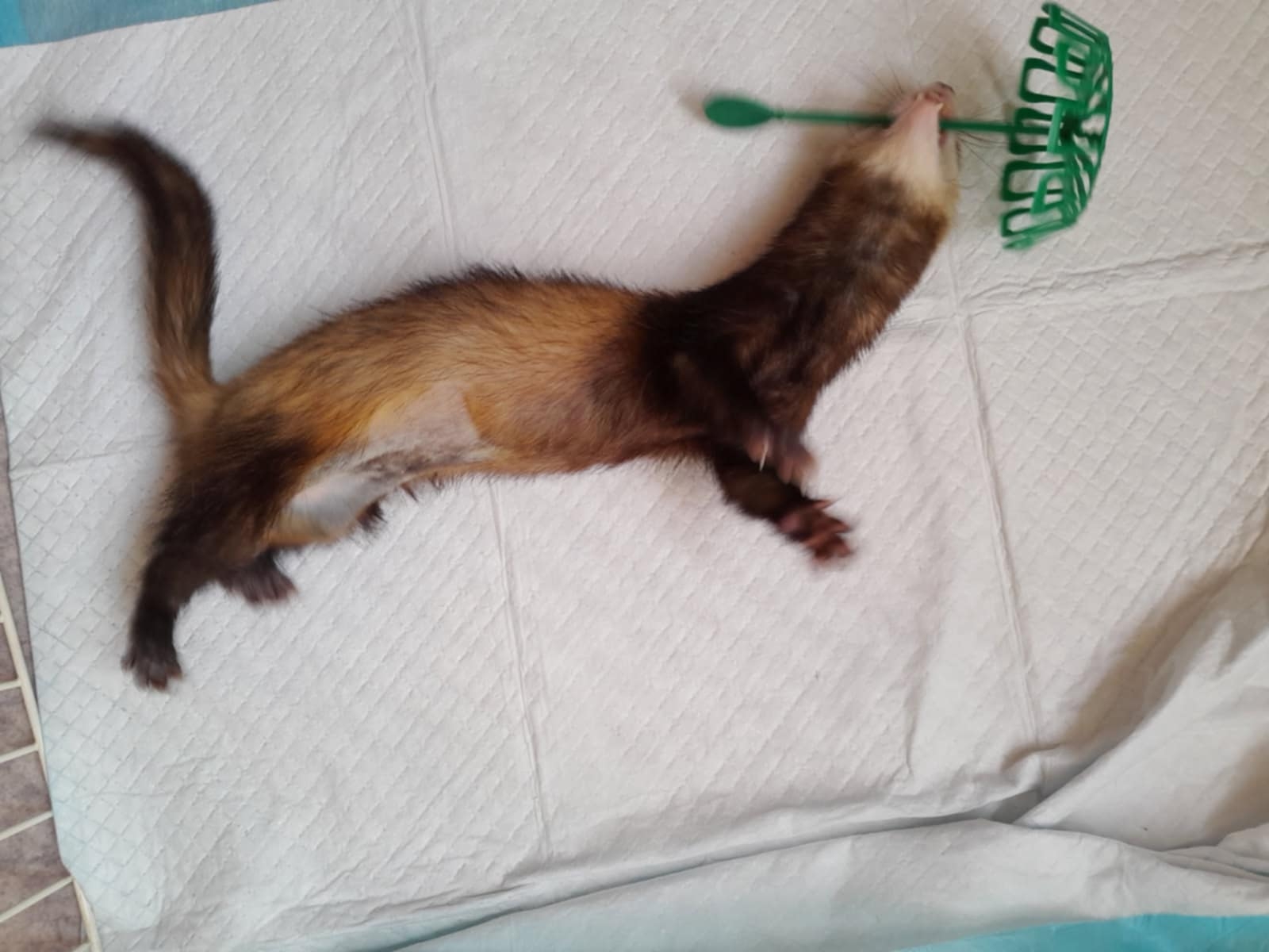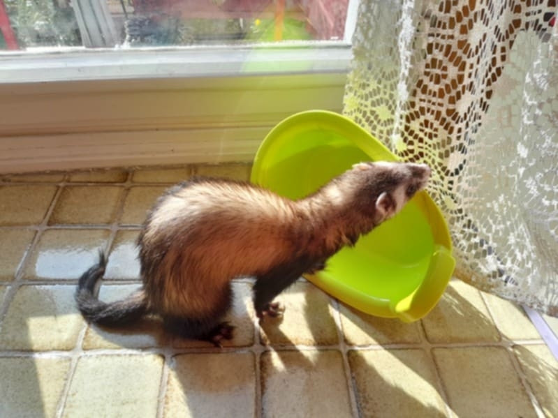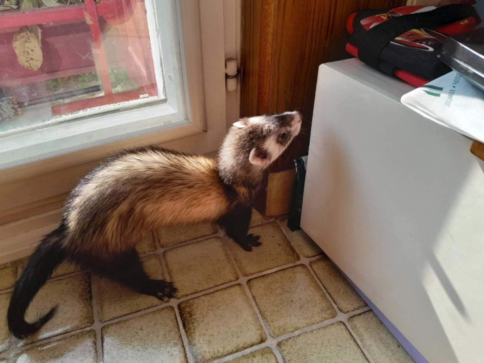 C'est une petite furette putoisée d'un an, toute mignonne, toute gentille, nourrie aux croquettes mais elle aime bien aussi la pâtée pour chat et la viande.