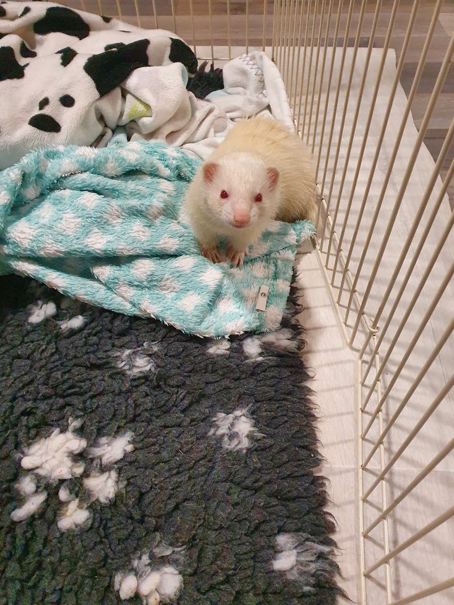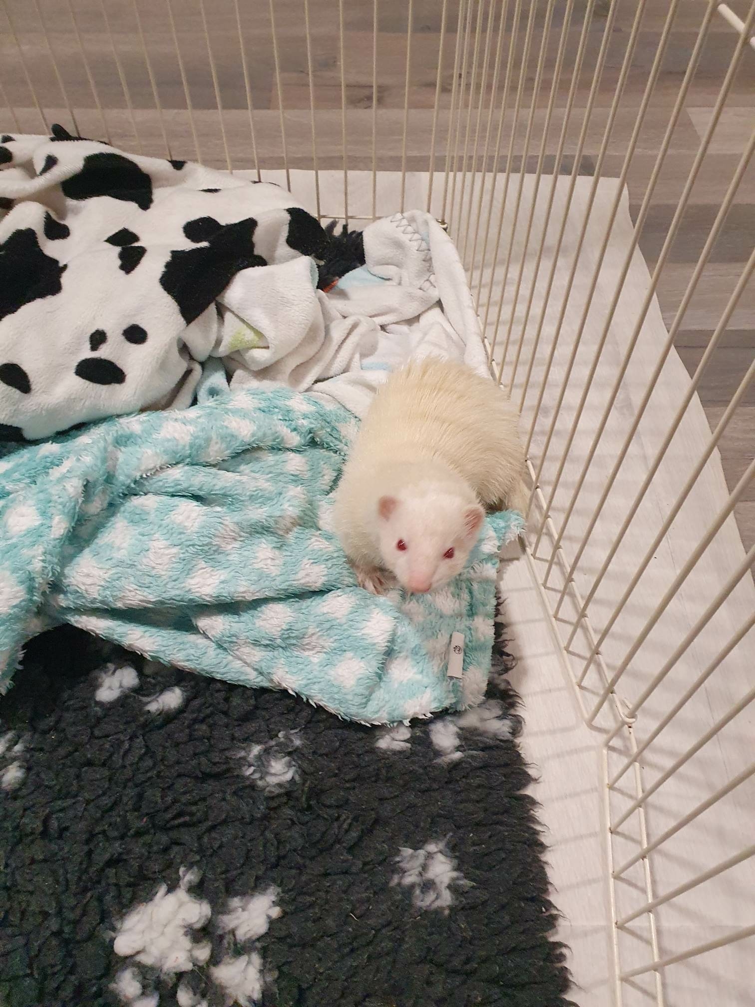 C'est un bel albinos d'un an et demi environ, bien blanc, dodu et bien touffu. Vif, intelligent et joueur.